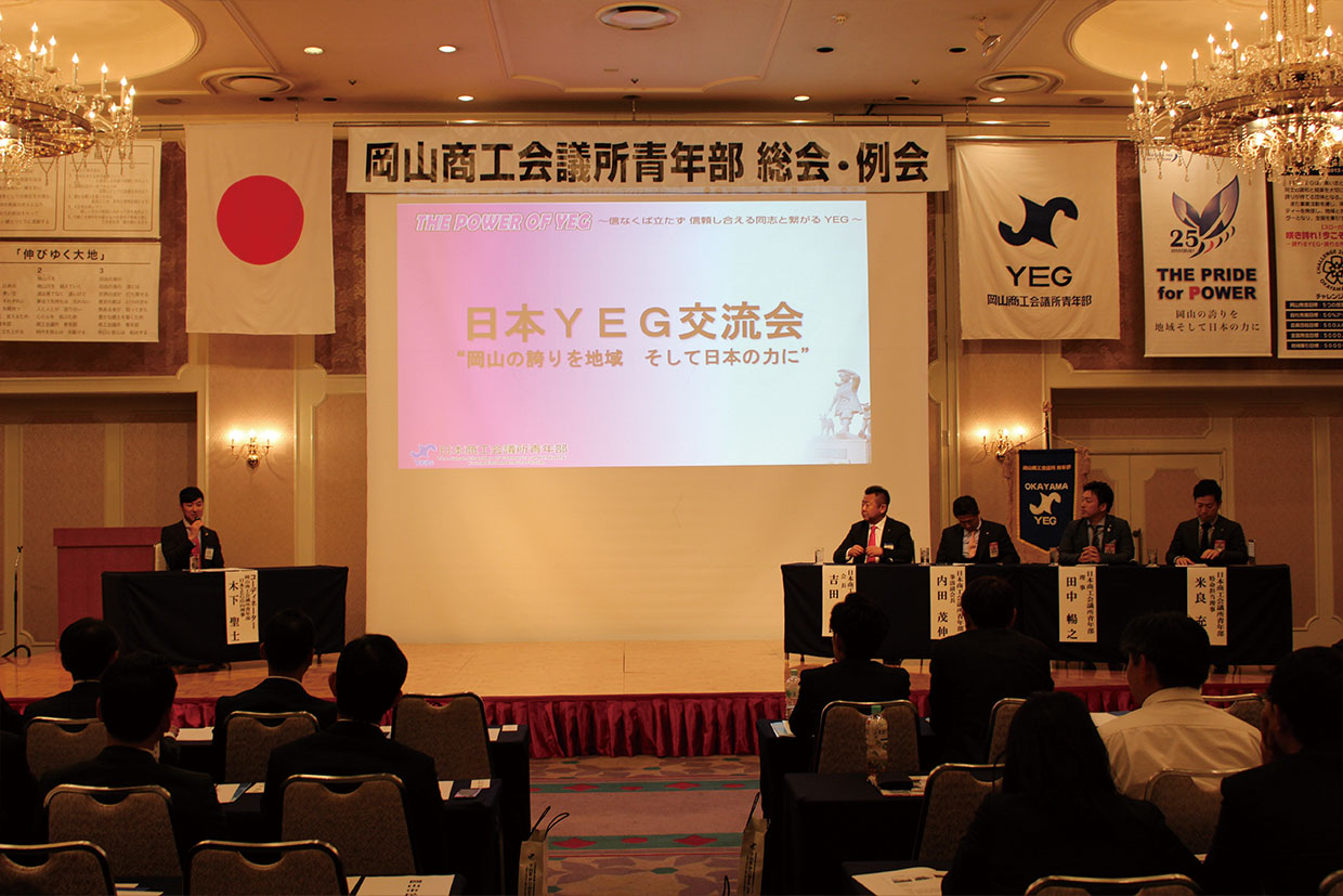 また、今年度、岡山から初選出された日本YEGの吉田大助会長や内田茂伸次年度会長予定者らを迎えたパネルディスカッションを行い、全国大会開催のエピソードや会を通じて得たものなどを意見交換。平成28年に岡山で行われた全国大会を経験していない会員が増えてきている中、大会の意義を知る貴重な時間となった。