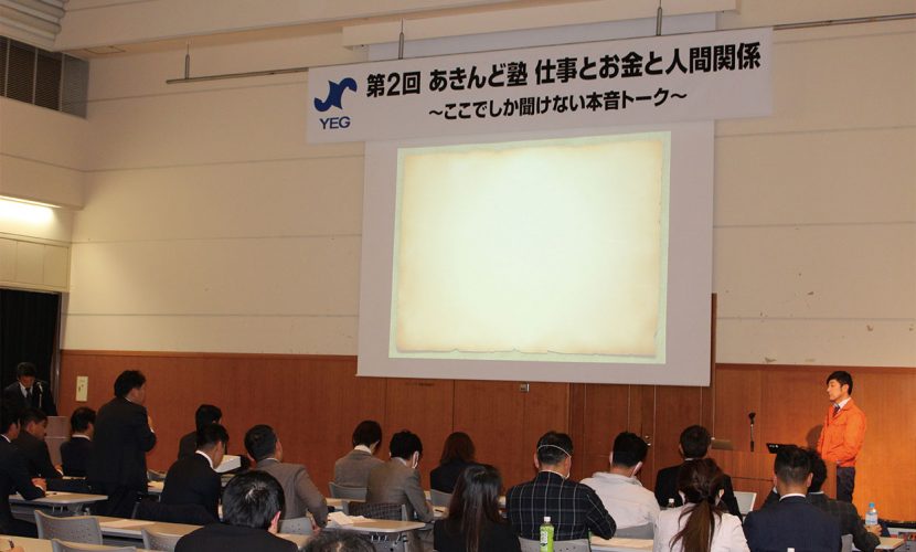 1月31日、岡山国際交流センターにて「第2回あきんど塾『仕事とお金と人間関係』〜ここでしか聞けない本音トーク〜」を開催し、約100人が参加した。8月に行った第1回あきんど塾のアンケートで、もっと深い話が聞きたかったという声が多かったため、岡山YEGの上田和生常任理事顧問と木下聖士オリエンテーション委員会委員長が引き続き登壇。「自分が変わらないと周りは変わらない」「社員に対しては、本気・本音ですべてを話す」など企業成長に関する体験談やターニングポイントなどユーモアを交えながら講話。参加者それぞれが気づきや学びを得られる有意義な時間となった