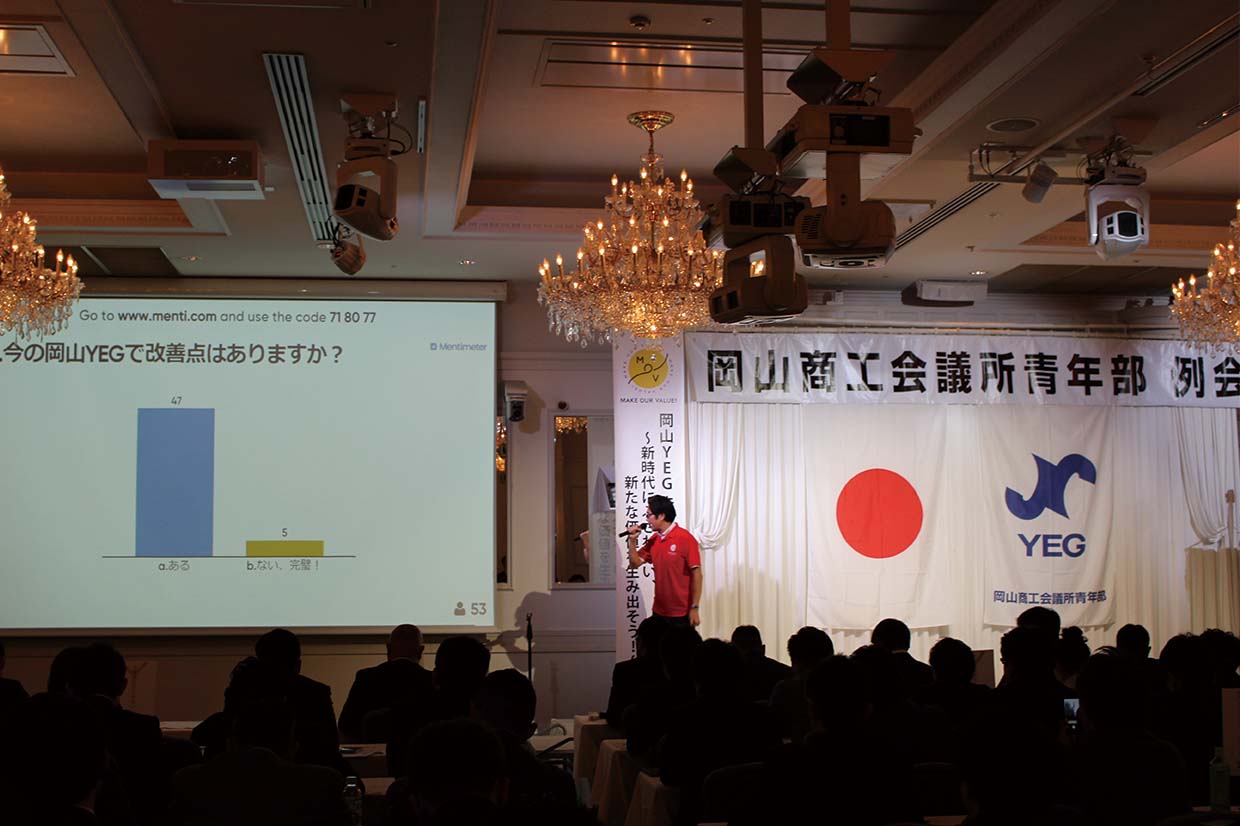 例会後には、会議ユニットによる「岡山YEG未来会議」を実施。投票結果をリアルタイムで共有できるウェブシステム「メンチメーター」を活用して会員の意識調査を踏まえながら、自身のビジョンを考えることで、ビジョン策定の重要性を確認し、過去の岡山YEGによる政策提言内容の紹介や岡山をどう変えることができたかなどを学んだ。地元に対する岡山YEG活動の意義を会員全員で共有することができる貴重な会となった。