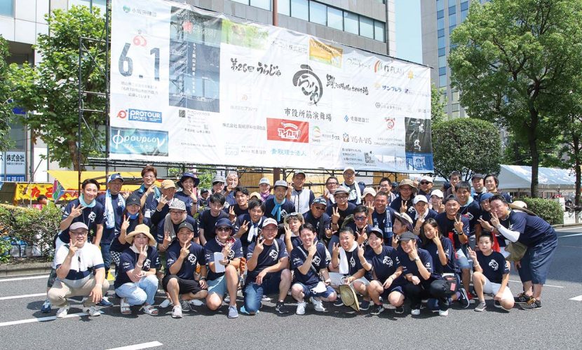 総踊りには、ボランティア参加メンバーも加わり大いに盛り上がった。長期ビジョンに掲げる「郷土の名も無きHEROES」として岡山活性化に貢献し、気持ちいい汗を流すことができた。