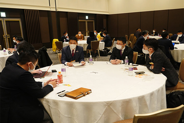 米良充朝会長が「YEGでつながった信頼し合える仲間同士、横にビジネスを広げてもらいたい」とあいさつ。その後、YEGでの出会いをきっかけに岡山YEG光森敬祐理事らが立ち上げたトレーラーハウス事業などを紹介した。グループディスカッションでは、業種別に分かれ、「地元じゃ聞けない業界情報交換」、「災害時における業種別部会の利用について」、「YEG会員同士でのビジネス連携のメリット」をテーマに意見交換した。